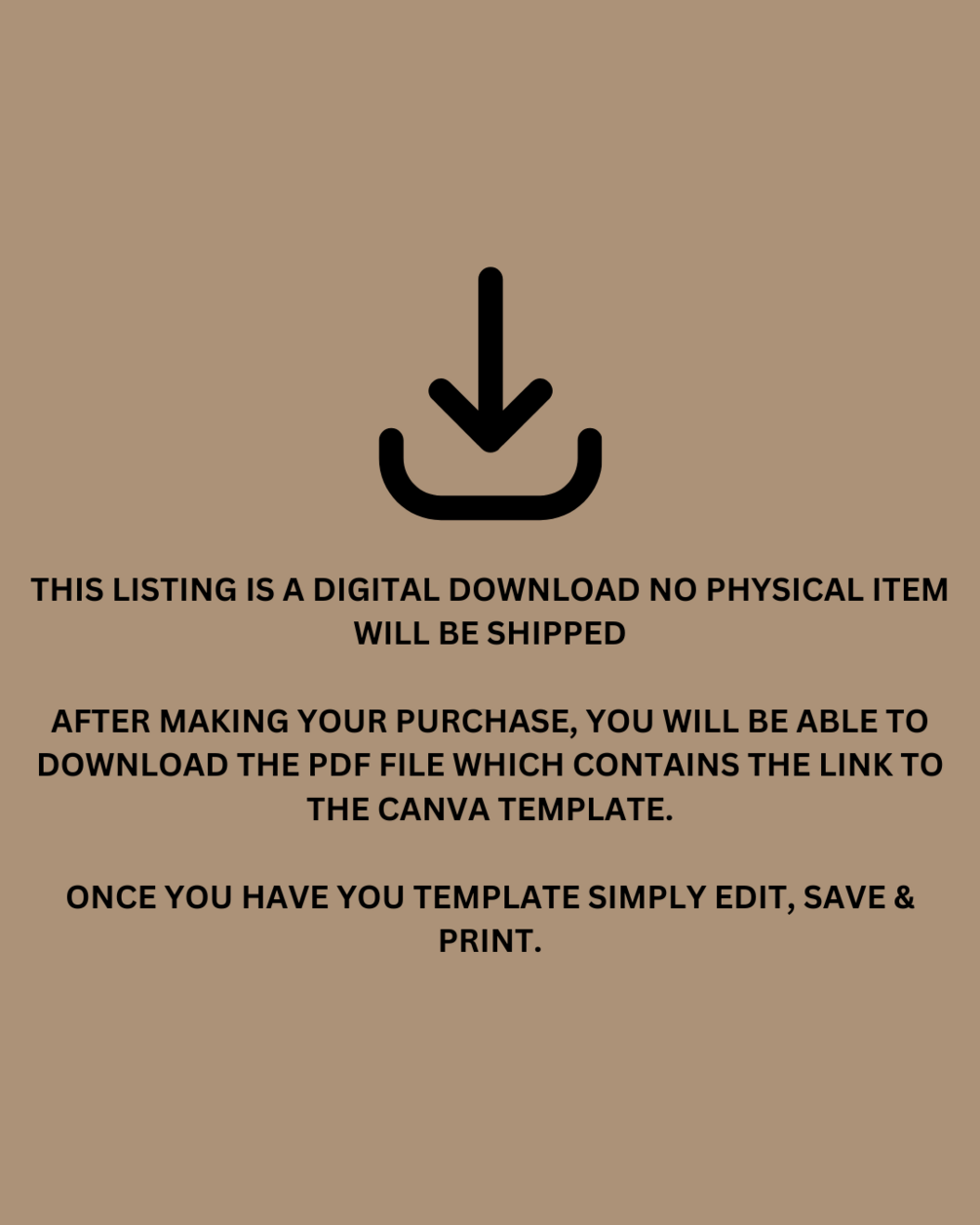 THIS IS A DIGITAL PRODUCT, NO PHYSICAL ITEM WILL BE SHIPPED. THIS FILE CONTAINS A TEMPLATE YOU MUST EDIT DOWNLOAD AND PRINT YOURSELF.